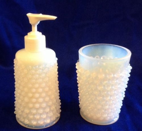 Title (ebay affiliate link): VINTAGE WESTMORELAND WHITE OPALESCENT MILK GLASS HOBNAIL BATHROOM VANITY SET