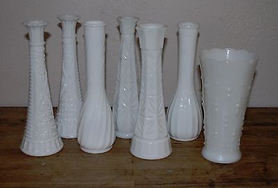 Title (ebay affiliate link): Lot of 7 White Milk Glass Flower Bud Vases Wedding Baby Shower Florist