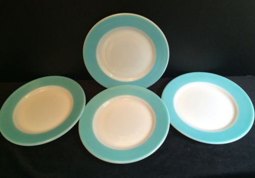 Title (ebay affiliate link): 4 Vtg Pyrex Double Tough Turquoise Aqua Band Milk Glass 9 " Salad Dinner Plate
