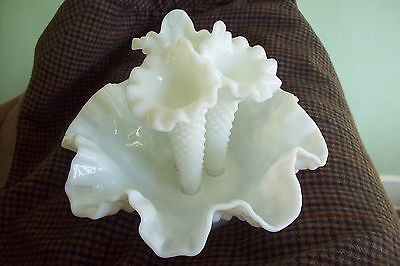 Vintage Fenton Milk Glass 3 Horn, 4-piece Hobnail Epergne Vase Set Ruffle