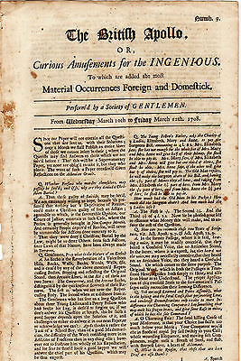1708 Original Antique English Publication Newspaper The British Apollo London