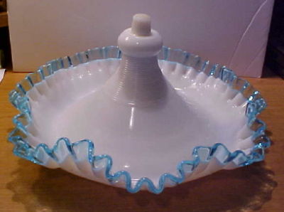 BLUE RIMMED THREADED EPERGNE ART MILK GLASS BASE BOWL