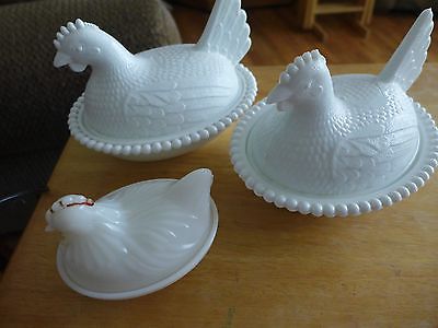 Three Vintage White Milk Glass Hen on a Nest Chicken Basket