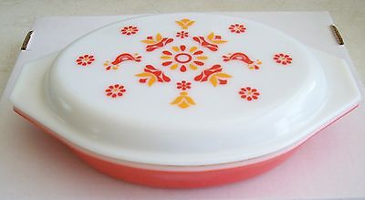VINTAGE Red FRIENDSHIP Divided 1 Qt CASSEROLE w White MILK Glass LID Birds