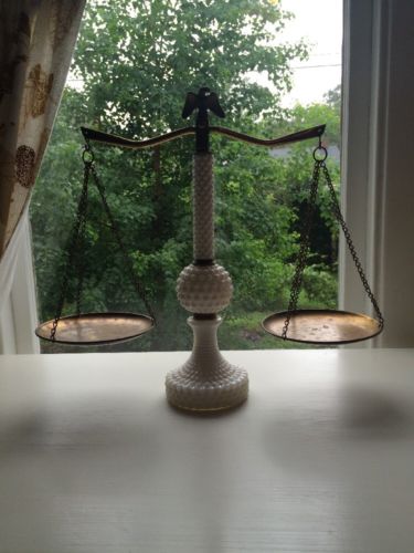 Title (ebay affiliate link): Vintage Milk Glass Brass Scale of Justice Weights Measures Law Hobnail Antique