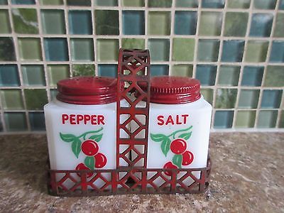 Tipp USA Milk Glass Salt & Pepper Shakers Range Set Red Lids with Cherries