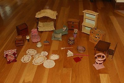 Title (ebay affiliate link): Lot Antique and Vintage Dollhouse Furniture and Room Items including Canopy Bed