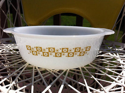 Title (ebay affiliate link): FIRE KING Vintage Royal Star Glow Atomic Gold Milk Glass Bowl
