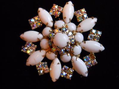Title (ebay affiliate link): Vintage Juliana Milk Glass & Aurora Borealis Tint Prong Set Rhinestone Brooch