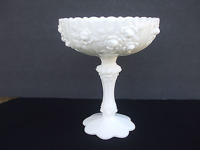 VINTAGE FENTON MILK GLASS TALL COMPOTE IN ROSE DESIGN