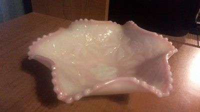 Title (ebay affiliate link): Fenton Pink & White Milk Glass Ruffled Edges Floral Design Bowl/Candy Dish