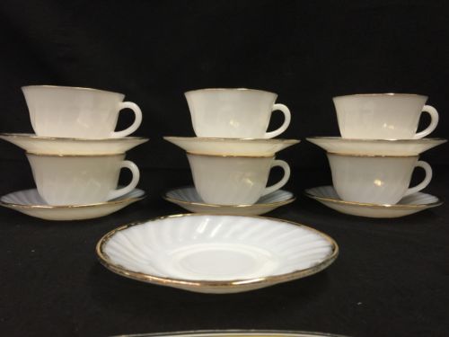 Title (ebay affiliate link): Vintage Fire King Tea Cup and Saucer Milk Glass Oven Ware Swirl White Gold