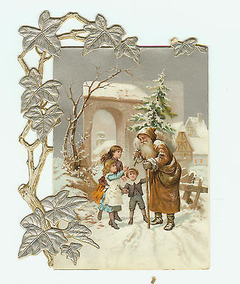 Title (ebay affiliate link): Christmas card with brown-suited Santa, tree & kids; embossed border