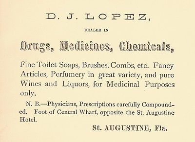 1875 D. J. LOPEZ DRUGS, MEDICINES, CHEMICALS ST. AUGUSTINE FLORIDA ADVERTISEMENT