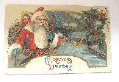 CHRISTMAS SANTA SAC ON BACK DOLL-HOUSE W/HOLLY RICH COLORS CIRCA 1913 PC