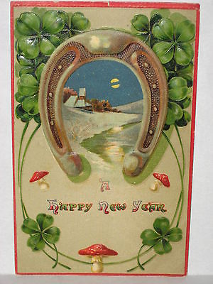 1910 POSTCARD HAPPY NEW YEAR, HORSESHOE & SHAMROCKS, MUSHROOMS