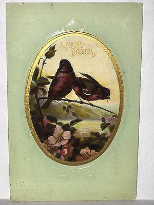 1911 POSTCARD HAPPY BIRTHDAY, PAIR OF COLORFUL BIRDS ON BRANCH