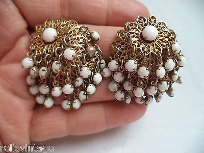 GORGEOUS VINTAGE HIGH END DANGLE MILK GLASS CAB FLOWER CLIP EARRINGS!!! 3149V