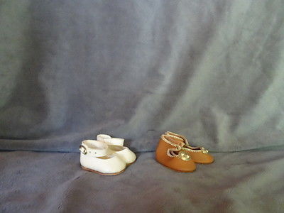 Two Pairs Vintage Antique Doll Shoes Off white Oilcloth Brown Leather w Brass