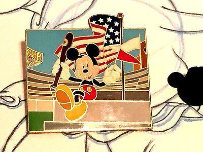 Title (ebay affiliate link): MICKEY MOUSE Baseball (Red Banner) STADIUM AMERICAN FLAG DISNEYLAND DISNEY PIN