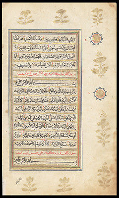 Title (ebay affiliate link): Rare Illuminated Koran Manuscript Leaf Red Sura Gold Floral Borders Mughal India
