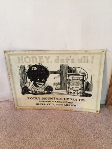 Title (ebay affiliate link): Vintage RARE Black Americana Rocky Mountain Honey Embossed Tin Tacker Sign- NICE