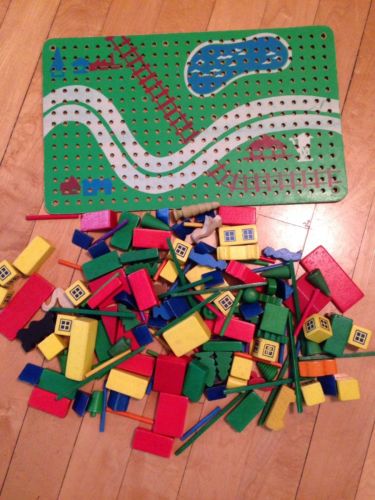 Title (ebay affiliate link): Vintage Wood Village Houses Trees Cars Animals Colorful Blocks Pegboard