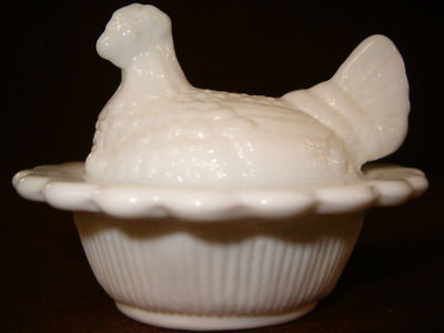 WHITE OPAQUE MILK GLASS HEN CHICKEN ON NEST BASKET DISH