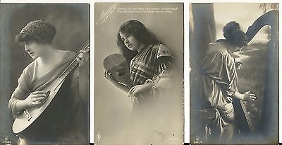 A75- LOT OLD 3 RRPC REAL PHOTO ORIGINAL POSTCARDS WOMAN MUSIC HARP INSTRUMENTS