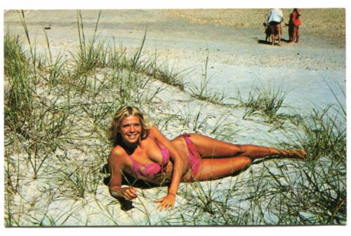 Title (ebay affiliate link): (#503) Beautiful Blonde Smiling Bikini Beach Swimsuit Pinup Girl 1960s Postcard