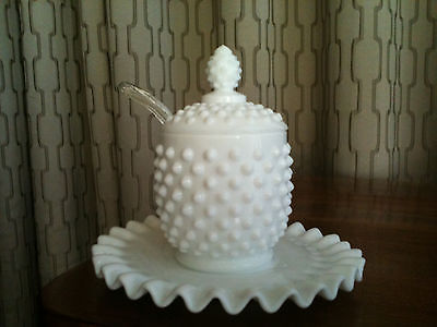 Title (ebay affiliate link): FENTON HOBNAIL MILK GLASS 4 PIECE JAM JELLY JAR WITH SPOON + UNDERPLATE