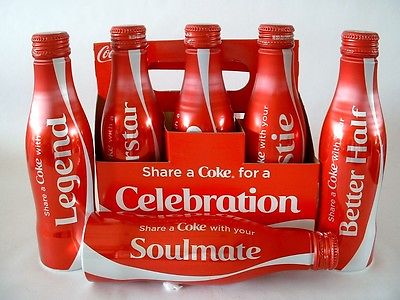 Title (ebay affiliate link): NEW 6 PACK COCA COLA 8.5 OZ BOTTLES OF SHARE A COKE COLLECTIBLE ALUMINUM BOTTLES