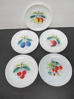 5 ANTIQUE MILK GLASS FRUIT PLATES 7 1/2" HAND PAINTED PLATES