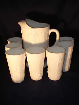 Title (ebay affiliate link): INDIANA GLASS CO MILK GLASS HARVEST GRAPE ICE-LIP PITCHER W/ (7) TUMBLER GLASSES
