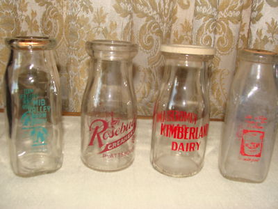 Lot of 4 vintage 1/2 pint milk bottles w/ paper caps