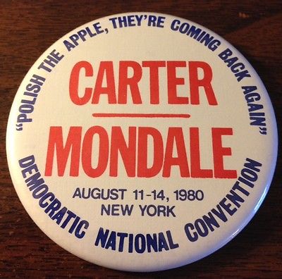 Title (ebay affiliate link): 1980 DNC Carter/Mondale "Polish the Apple, They're Coming Back" Pinback Button
