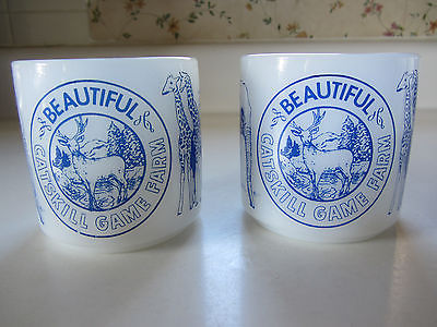 2 Vintage Federal Milk Glass Catskill Game Farm Cups Mugs White w/Blue Graphics
