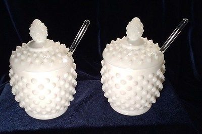 Title (ebay affiliate link): Vintage Fenton Hobnail Milk Glass Jam Jelly Condiment Jars with Spoons 6 pieces!