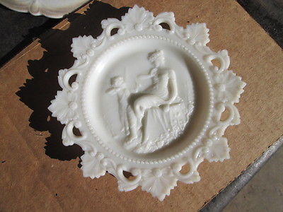Title (ebay affiliate link): attractive 7 3/8" dia. milk glass plate. image is cupid shooting a young woman