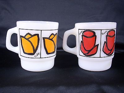 2 Anchor Hocking Fire King Tulip & Rose MIlk Glass Mugs