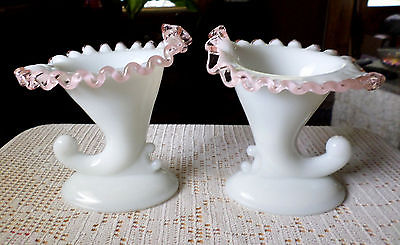 Vintage Pair of Fenton Milk Glass Rose Crest Cornucopia Tapered Candle Holders