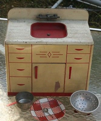 Title (ebay affiliate link): Vintage 1940's WOLVERINE TIN toy KITCHEN SINK RED & white w faucets