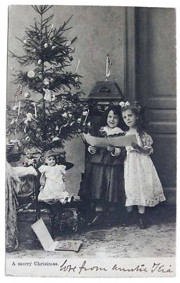 Title (ebay affiliate link): 1903 VICTORIAN XMAS SCENE FEATHER TREE ANTIQUE DOLL KID