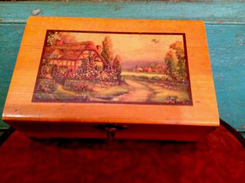 Title (ebay affiliate link): Vintage Antique Wooden Box, English Cottage Picture, Two Hinges, Four Feet