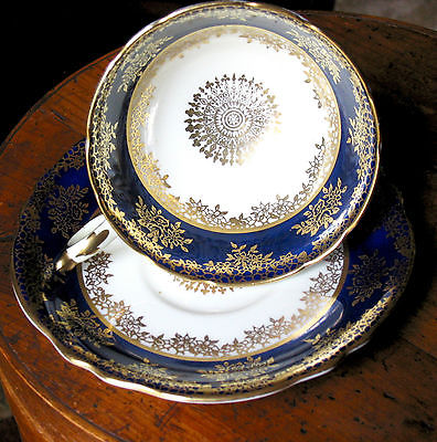 VINTAGE PARAGON TEACUP AND SAUCER FOOTED COBALT BLUE AND GOLD