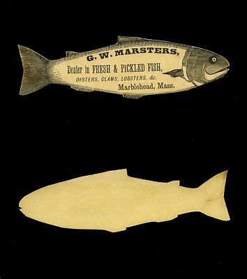 Title (ebay affiliate link): G.W. Marsters, Marbelhead, Mass. Fish Die Cut Advertises Oysters, Clams, Lobster