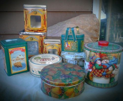 Title (ebay affiliate link): Lot of 9 Cookie Tins/Canisters-Holiday-Advertsing-Assorted - Mostly Vintage