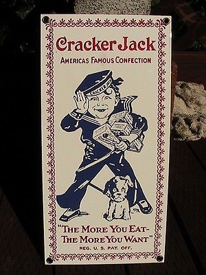 Vintage Ande Rooney Porcelain Enamel Steel Sign Cracker Jack 6"x12"
