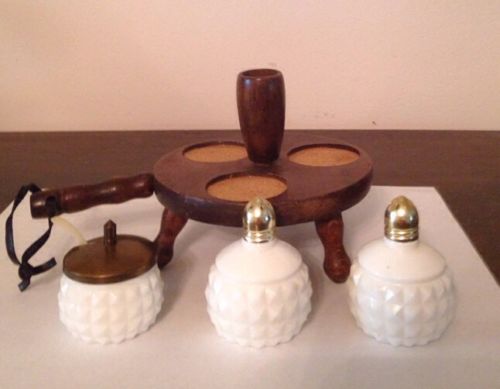 Vtg Hobnail Milk Glass Set Wooden Stand Salt & Pepper & Sugar Bowl Spoon, Brass