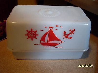 Vintage McKee milk glass with red ships butter dish, 6 1/2" wide, 3 " tall